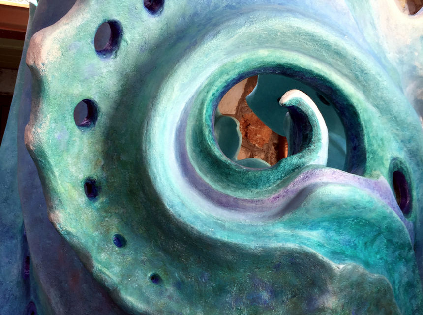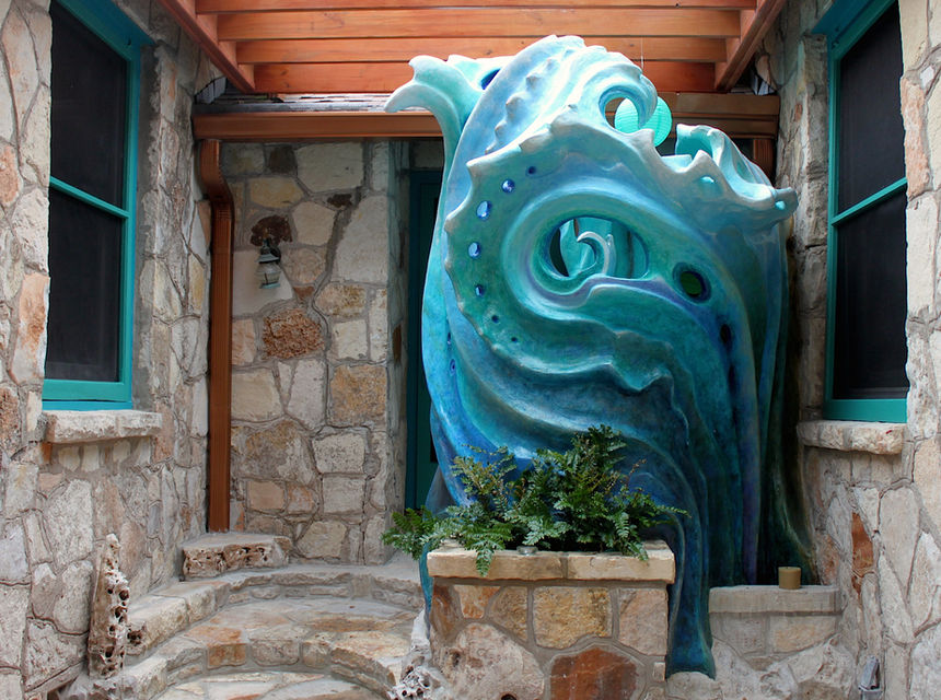 Starting with an uncovered ancient cement patio surrounded by a C-shaped stone house in S. Austin and a request for an outdoor shower, I was able to not only give them a shower, but also a rear entrance trellised patio with steps and planters using stone that matched their existing house. The ferrocement wave forms open to the sky as well as the yard. Inside are a 4-foot stone bench, colored mirror insets, a built0-in sink that tapers into wavy shelves, and hooks with fish shapes. The grey water empties into the yard.